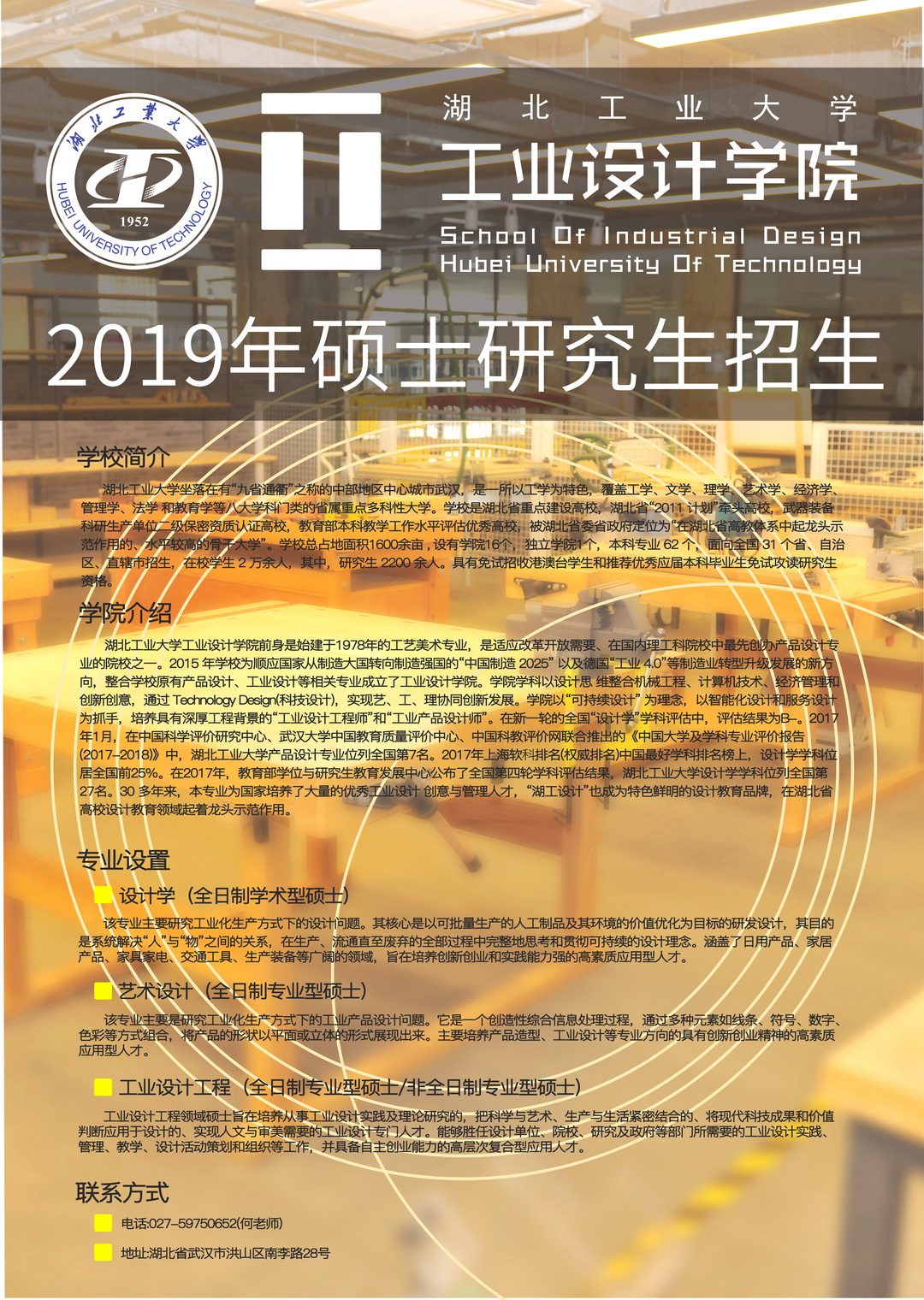 学校简介 湖北工业大学坐落在有“九省通衢”之称的中部地区中心城市武汉,是一所以工学为特色,覆盖工学、文学、理学、艺术学、经济学、管理学、法学 和教育学等八大学科门类的省属重点多科性大学。学校是湖北省重点...