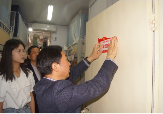 王地国为党员寝室进行授牌并作总结讲话。他指出,党员寝室挂牌既是展示荣誉,也是激励和鞭策。作为党员寝室的一员,一是要增强荣誉感,强化身份意识、纪律意识、规矩意识,做一个遵规守纪的好党员;二要发挥先锋模范作用,在政治思想、勤学励志、科技创新、文化体育、管理服务等方面追求卓越,发挥好示范引领作用;三是要模范践行群众路线,主动为身边同学服务,带头营造安全文明和谐宿舍,真正做到“建好一个寝室、带动一个班级、影响一个年级”。随后,王地国来到学生党员寝室走访检查,并同学生党员一起悬挂党员寝室标牌、张贴党员承诺书。