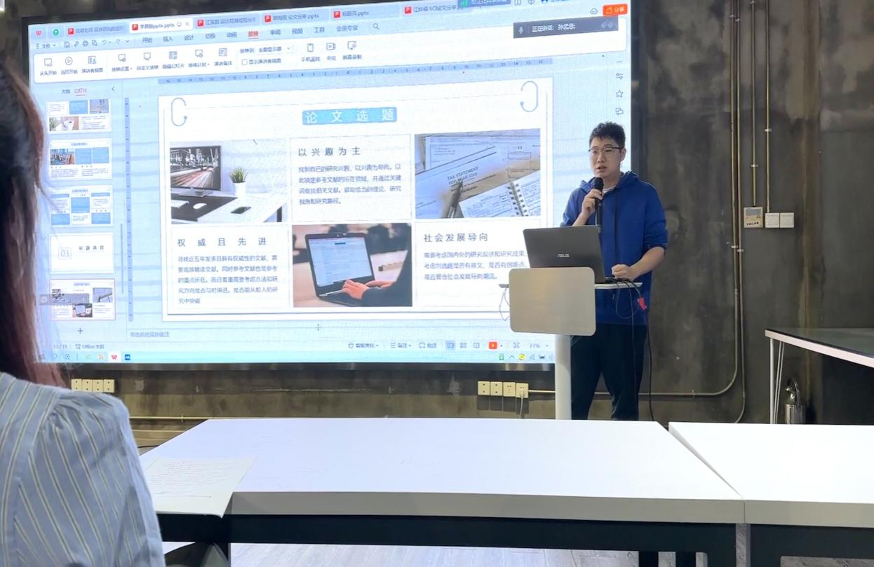 分享会正式开始之前,特别邀请到学院设计基础与理论系教师张萌为研究生们作学术分享交流,他以“设计研究的全球对话”为主题为同学们带来了一场生动而详实的有关外文期刊论文的检索、写作与发表策略的学术分享,给同学们在撰写高水平外文期刊论文方面带来很大启发。