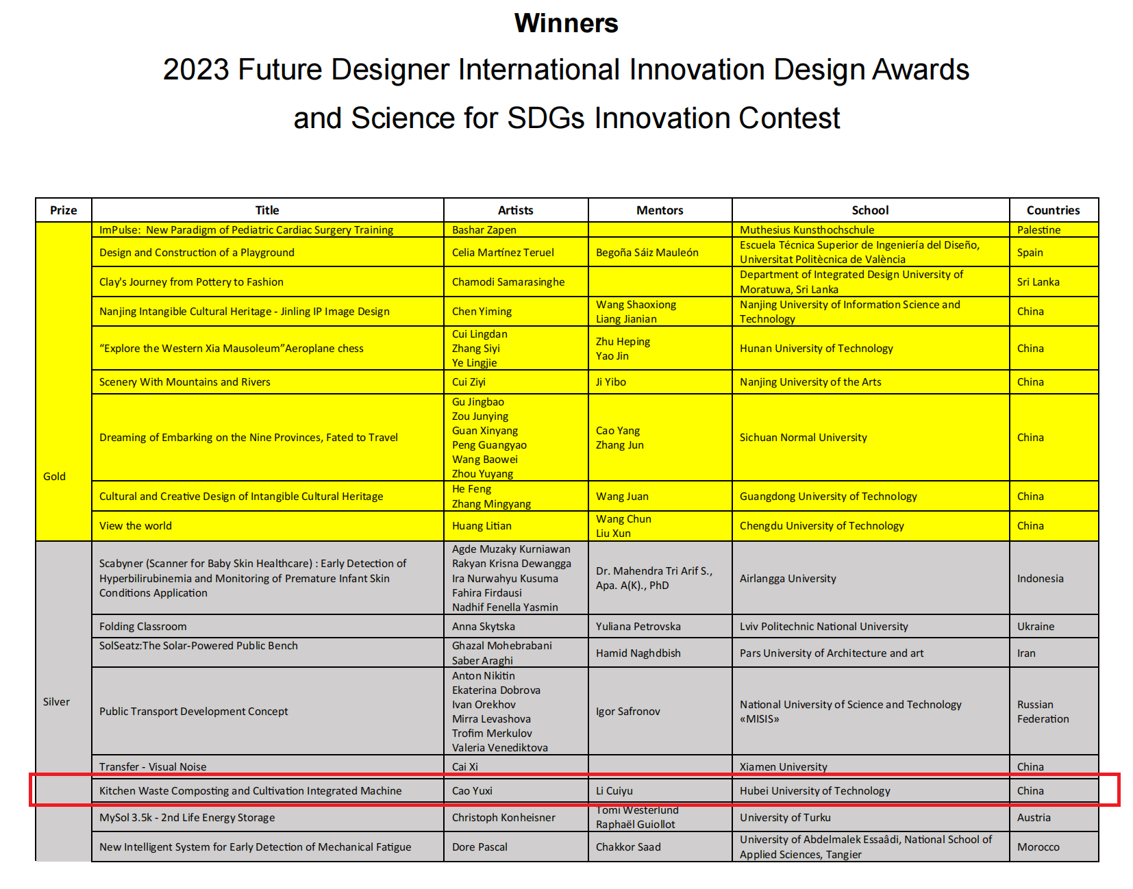 2023年12月24日,联合国教科文组织在其官网公布了2023首届未来设计师·国际创新设计大赛暨科技赋能可持续发展创新大赛获奖名单,我校amjs澳金沙门线路首页再次收获竞赛捷报,李翠玉老师指导,曹雨熙同学完成的作品《Kitchen waste composting and cultivation integrated machine》荣获银奖,这也是湖北省高校中唯一获奖作品。
