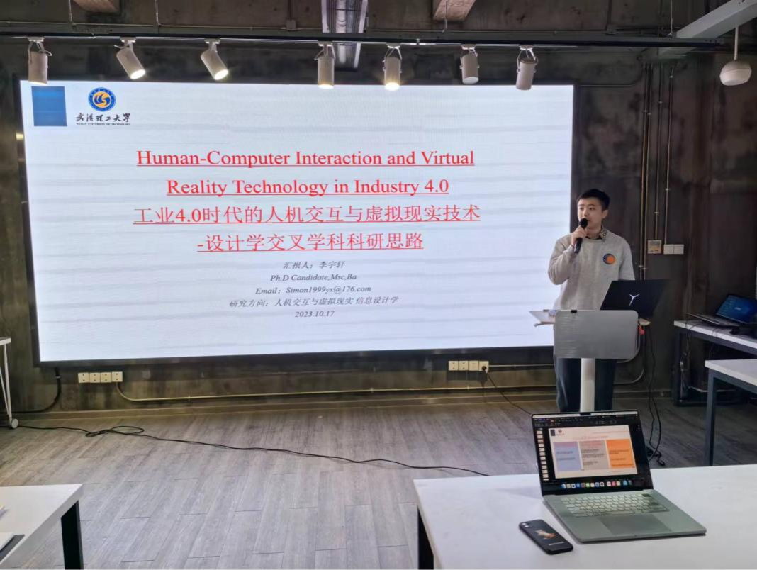 本次朋辈学术分享交流活动邀请到的分享嘉宾是从我院培养走出的2016级优秀学子代表、爱丁堡大学理学硕士、新加坡国立大学与武汉理工大学联合培养在读博士李宇轩,他的主要研究方向为多模态人机交互与虚拟现实、信息设计学,主要科研成果有作为第一或通讯作者发表SCI/SSCI检索论文6篇,中文核心2篇,参与武汉地铁重大横向项目与多项省部级科研项目。