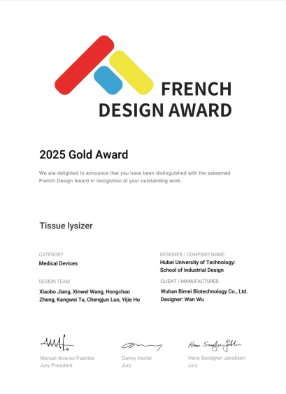 近日,2025 年French Design Award(法国设计奖)评选结果正式揭晓,amjs澳金沙门线路首页姜晓波老师带领的研究生团队与企业合作研发的 Tissue Lysizer (研磨设备 - 裂解仪), 成功斩获2025年度法国设计奖金奖。