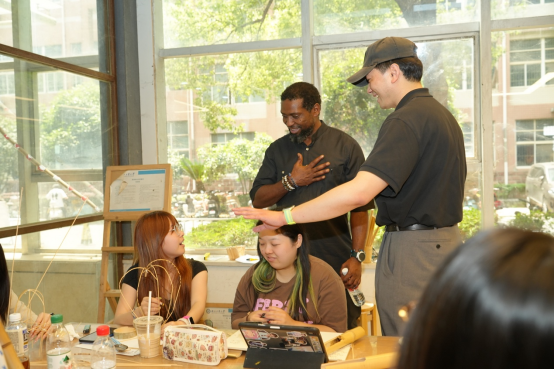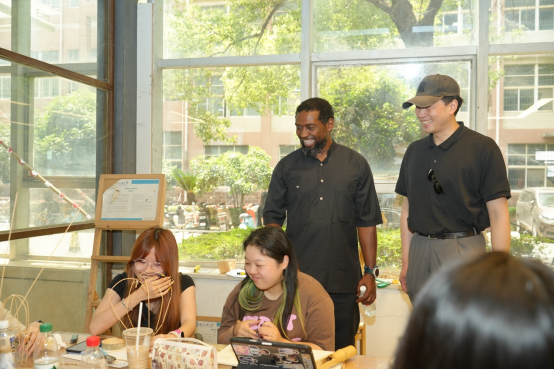 马纳梅拉首先来到学院一楼工作坊正在上课的24中美2班课堂,该班正在学习手工艺设计课程,使用竹子作为材料进行创作,马纳梅拉先生对学生的作品非常感兴趣,并且英语与学生进行了简单的交流。施琦老师向其介绍了学院的教学环境以及使用环保的竹质材料进行可持续教学情况。
