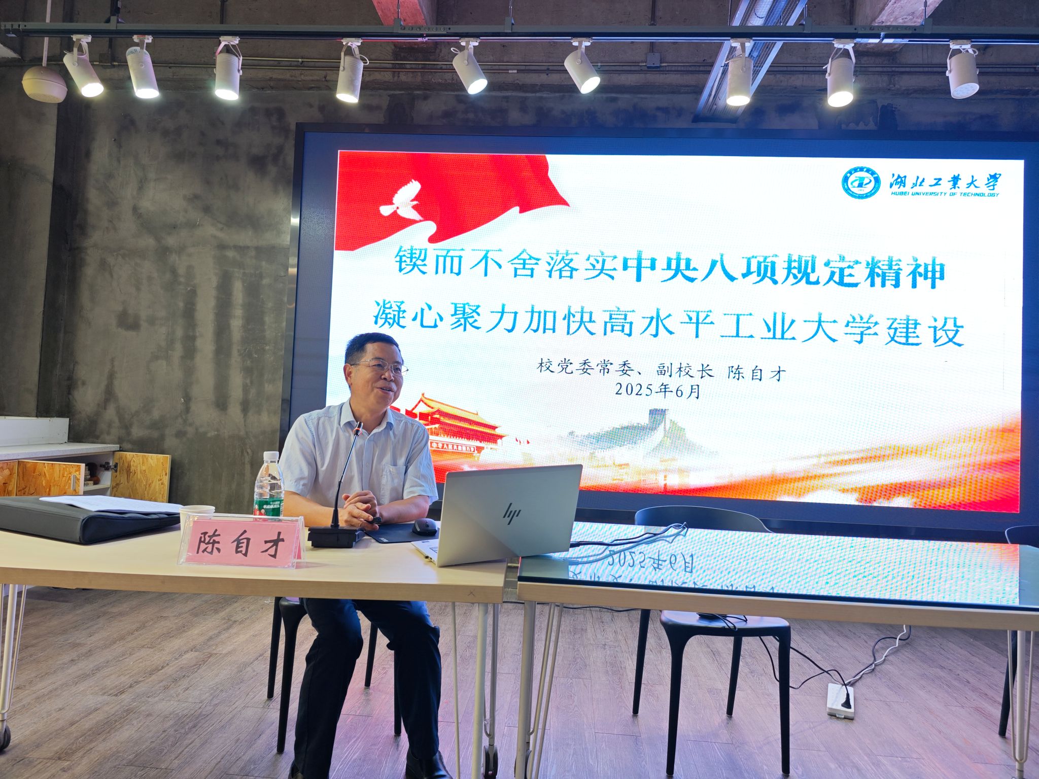 6月18日,校党委常委、副校长陈自才莅临amjs澳金沙门线路首页,以“锲而不舍落实中央八项规定精神,凝心聚力加快高水平工业大学建设”为主题讲授专题党课。学院领导班子、系主任、党支部书记参加学习,会议由党委书记王地国主持。