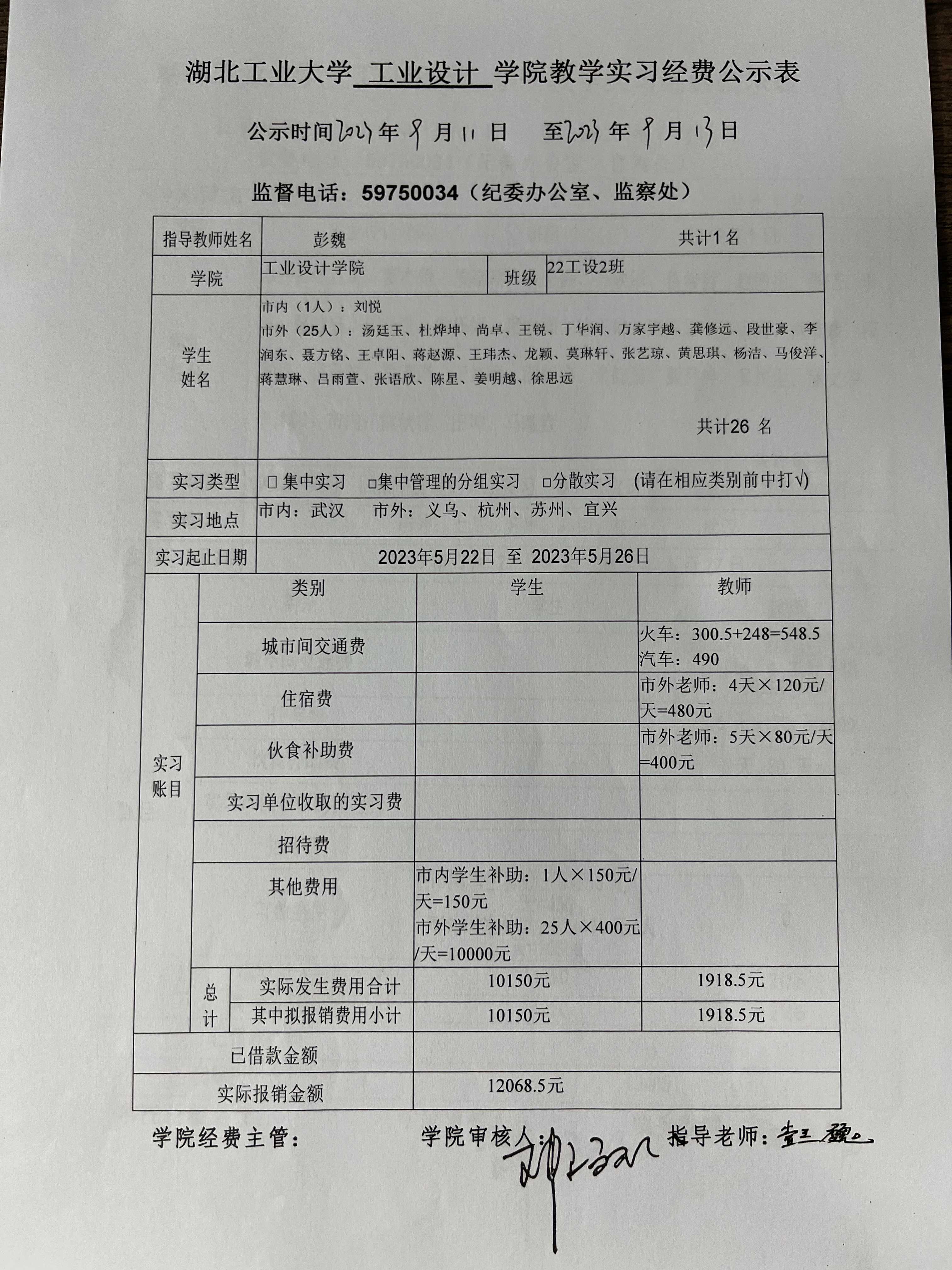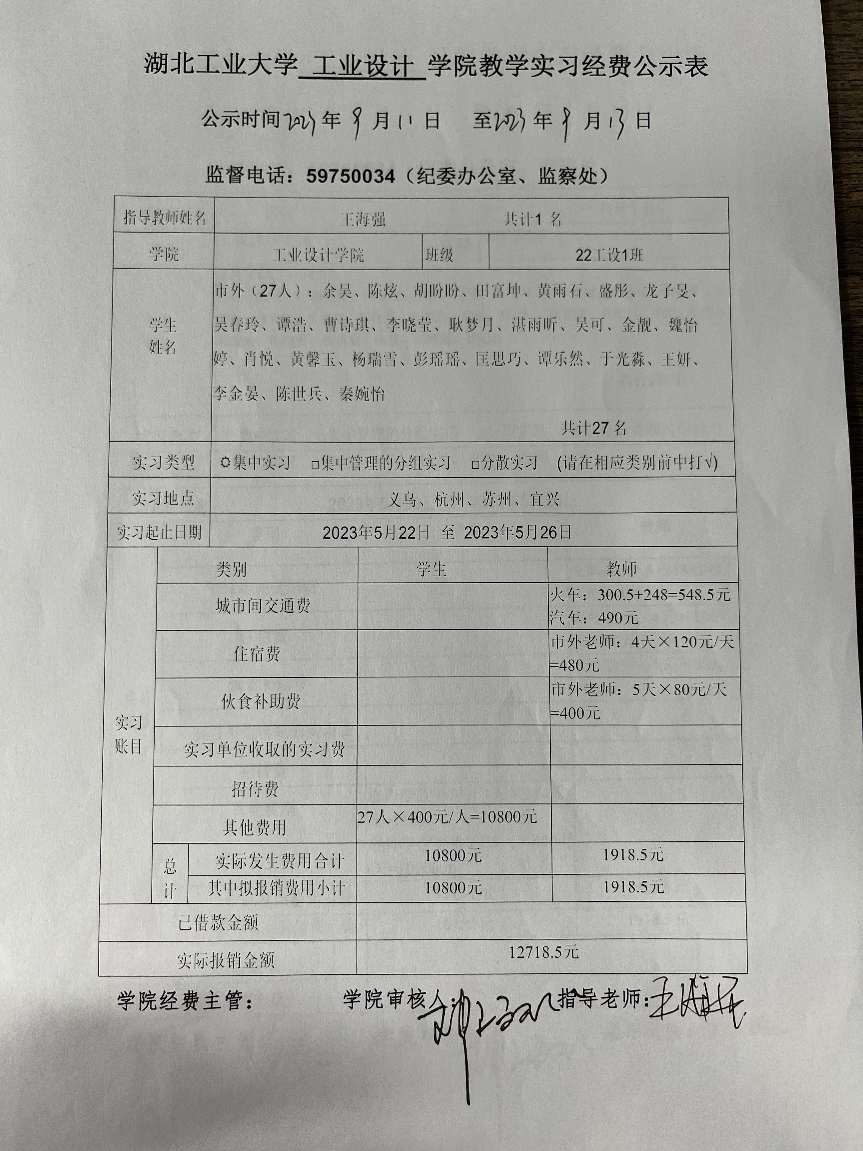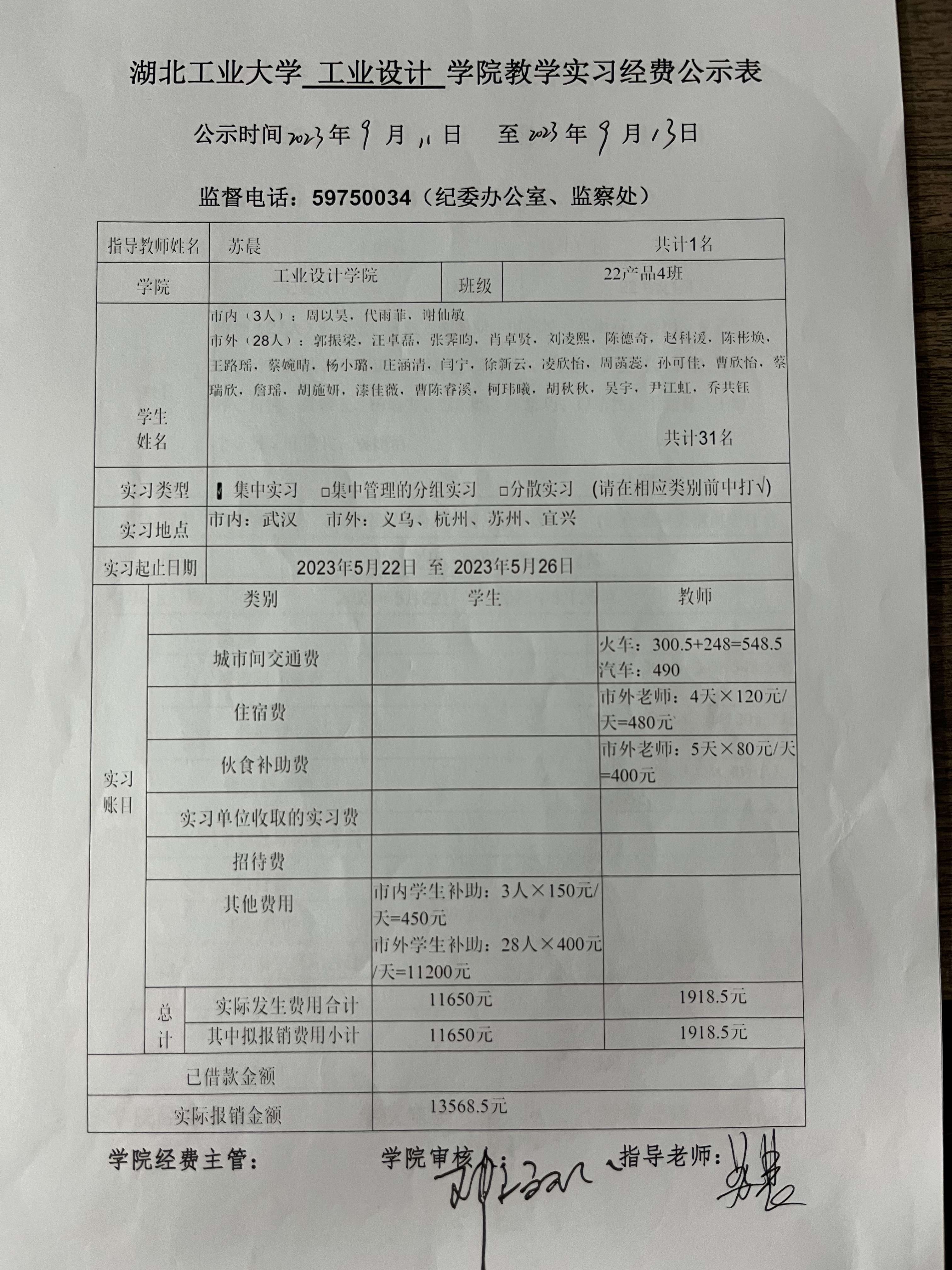 2022级《设计考察(一)》生产实习经费公示表