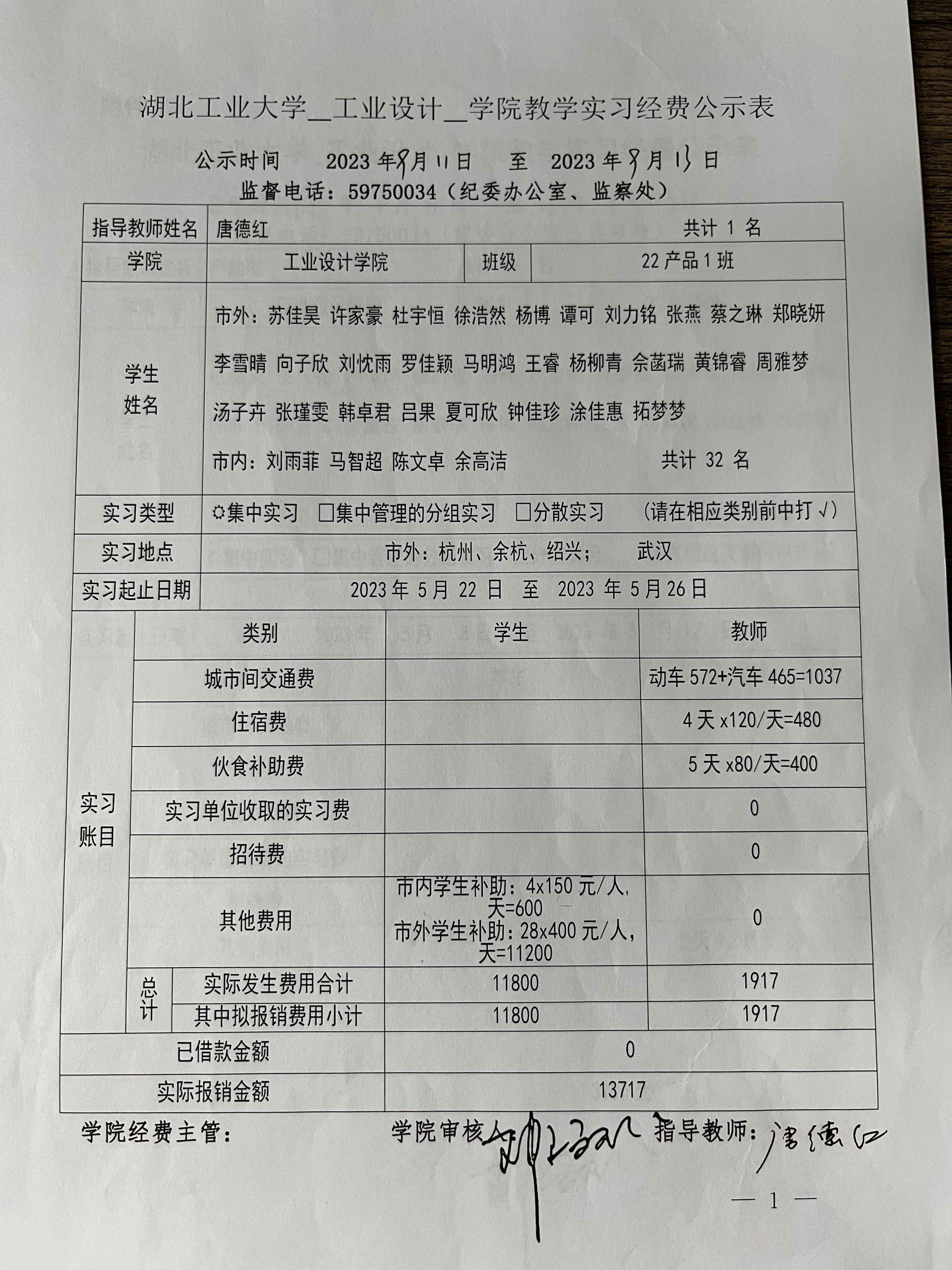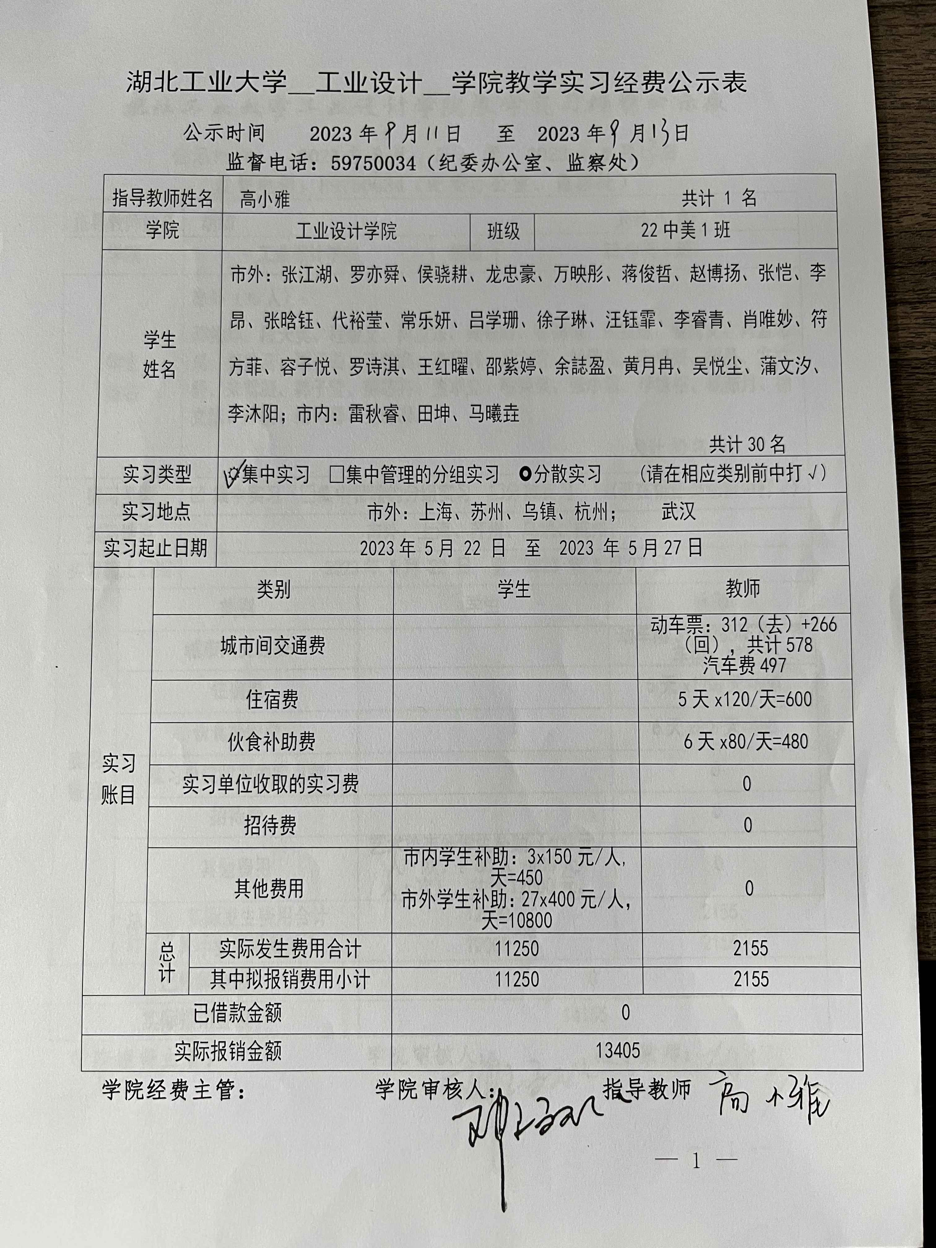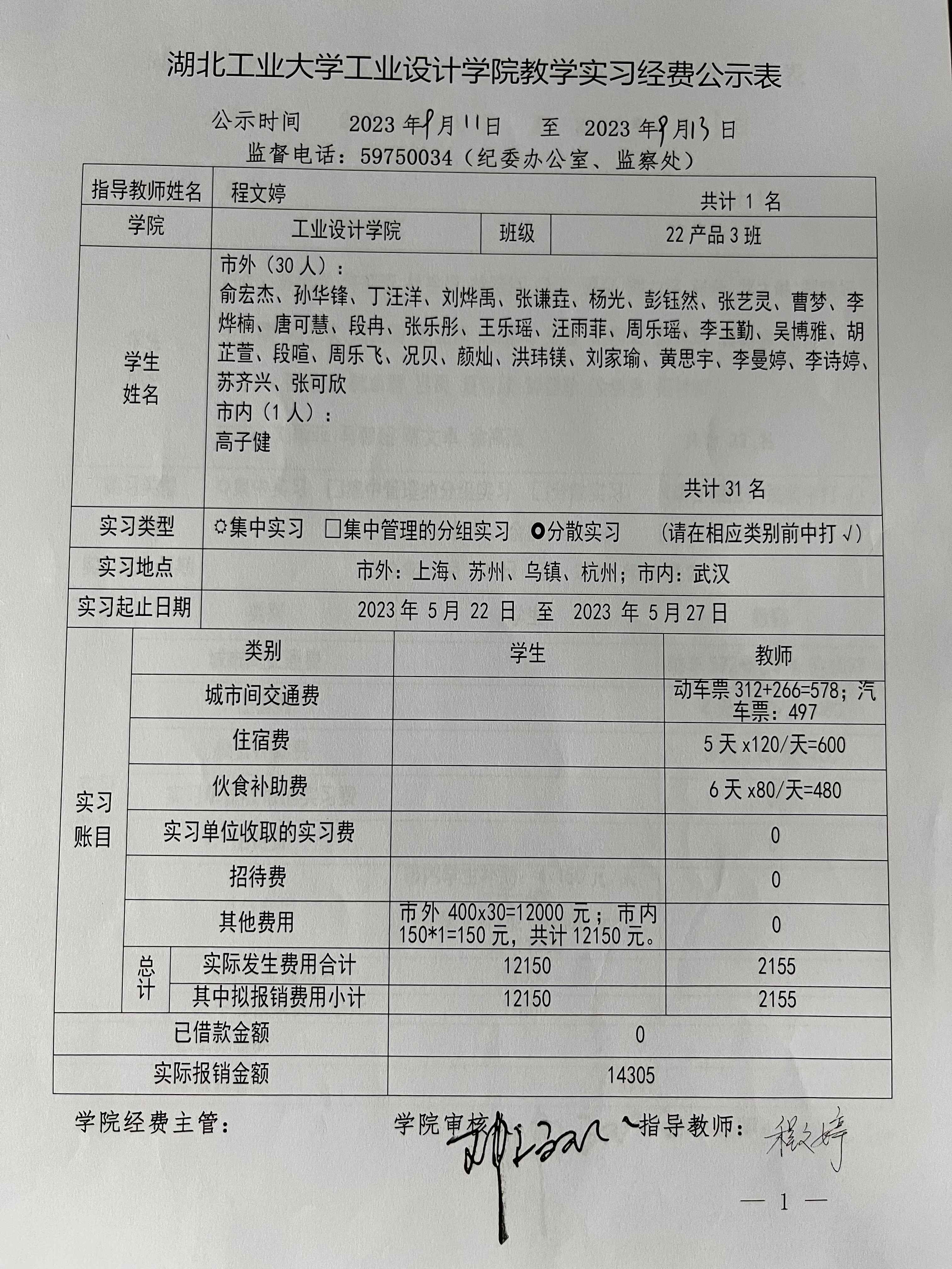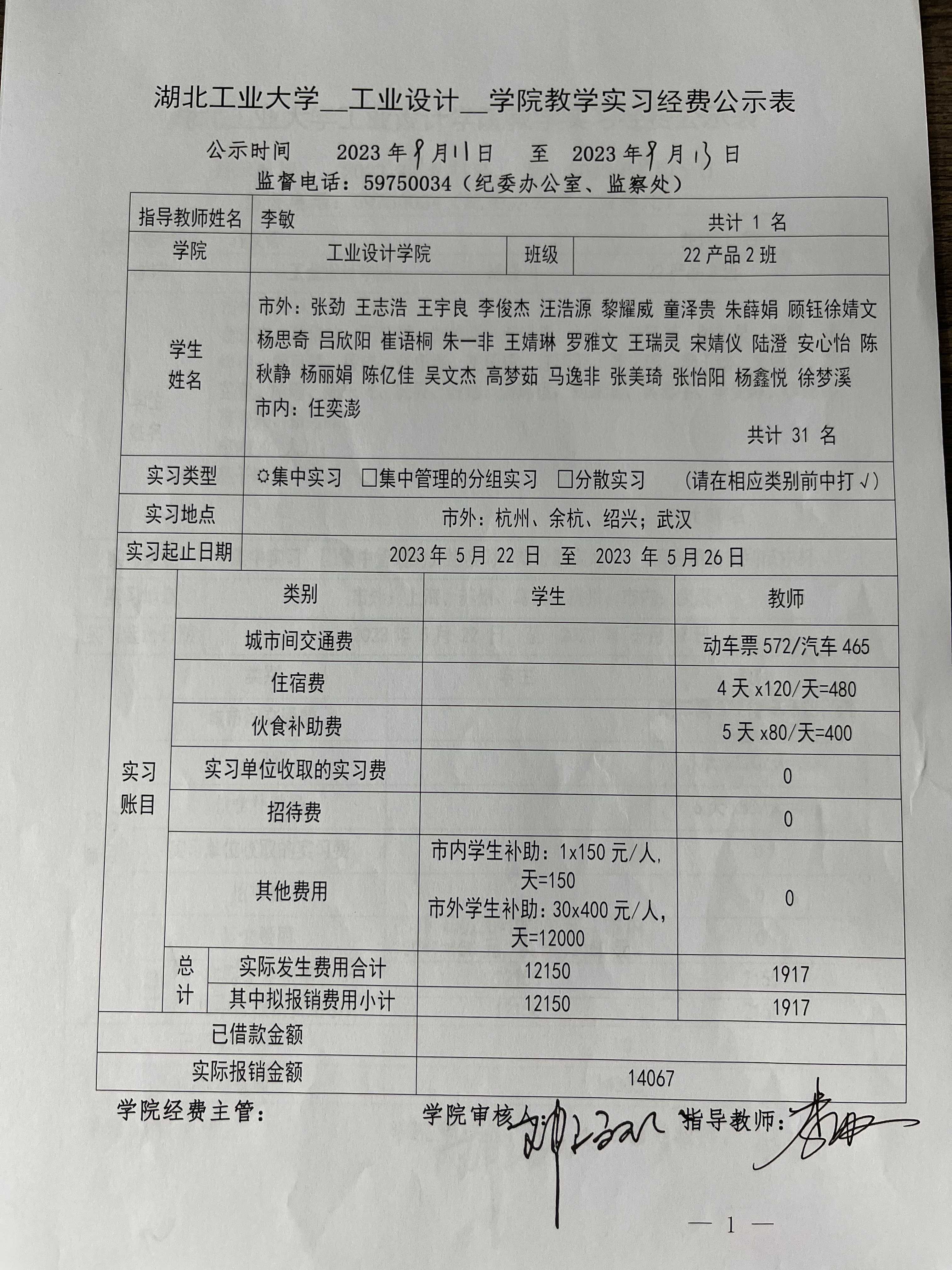 2022级《设计考察(一)》生产实习经费公示表