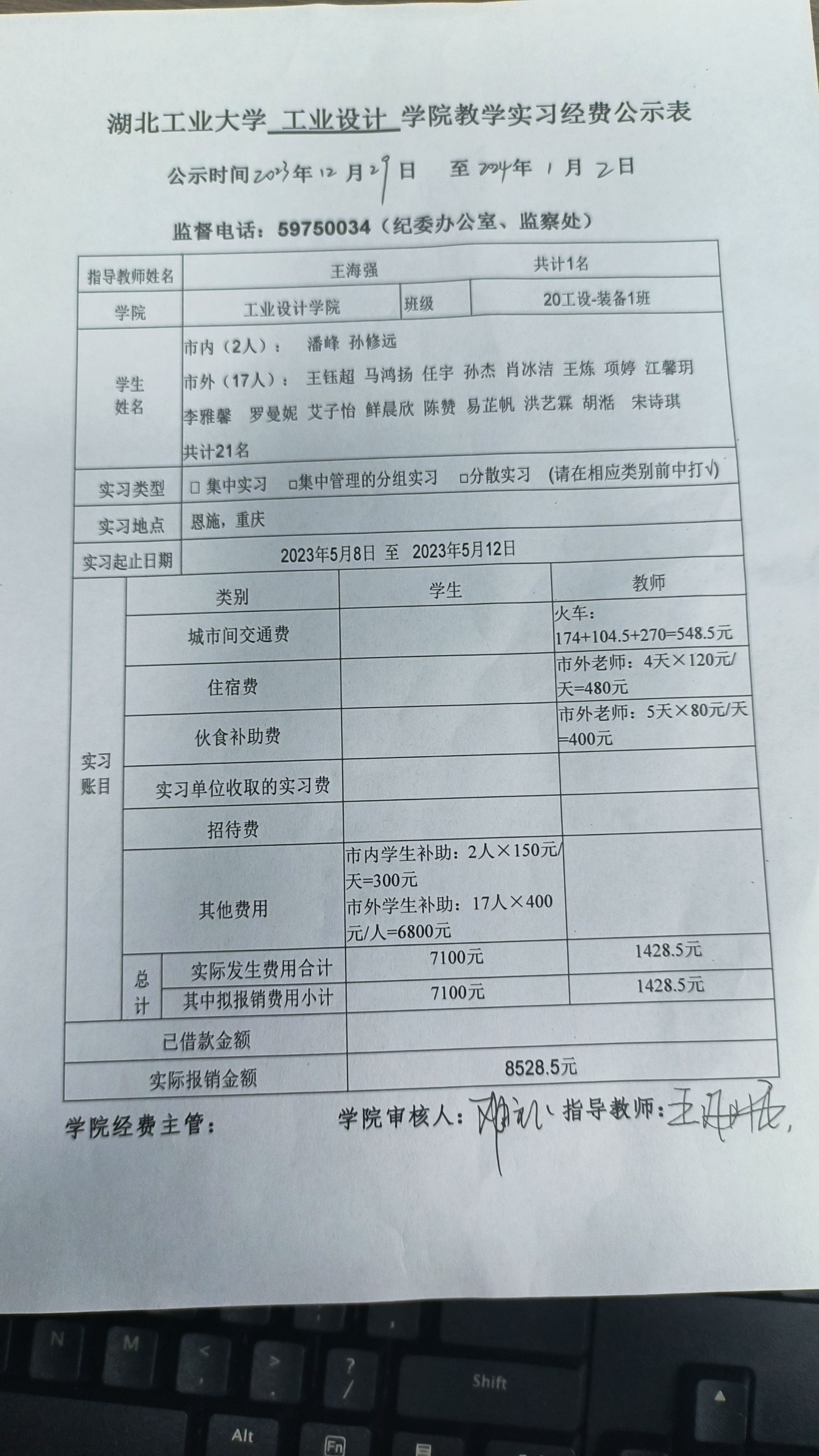 20工设_装备1班《设计考察(三)》生产实习经费公示表